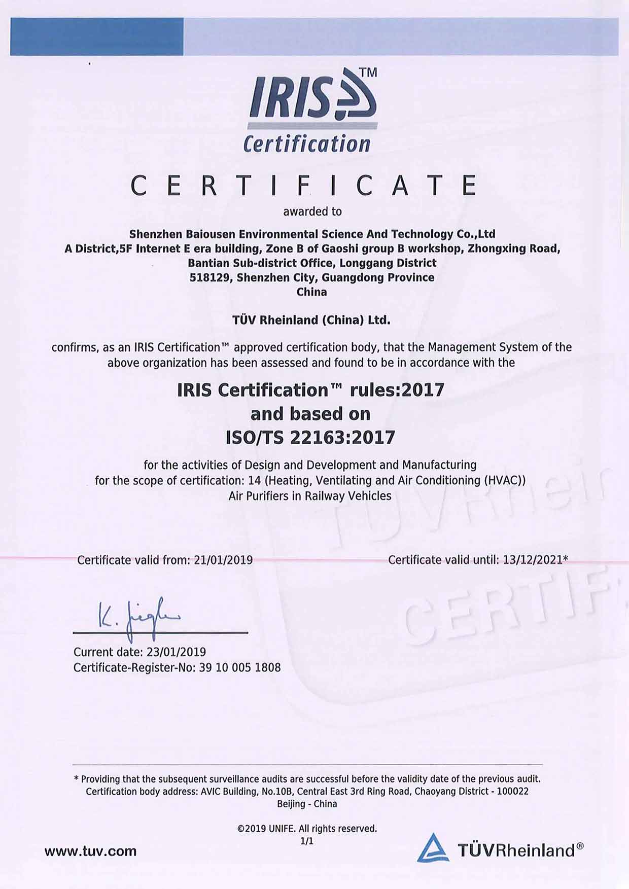 IRIS國際認證證書