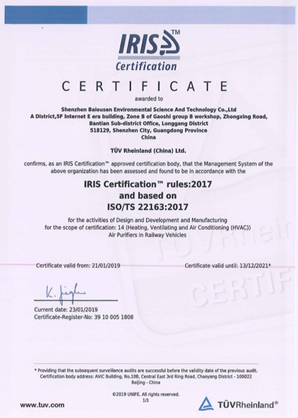 IRIS認證證書-獲得國際IRIS認證(TS22163)的空氣凈化企業