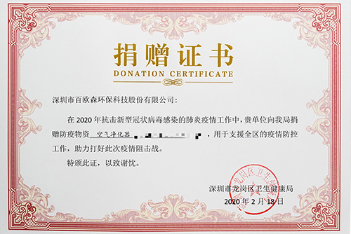 疫情期間,百歐森通過龍崗區科技創新局對龍崗區衛生健康局捐贈了一批價值消毒凈化器。